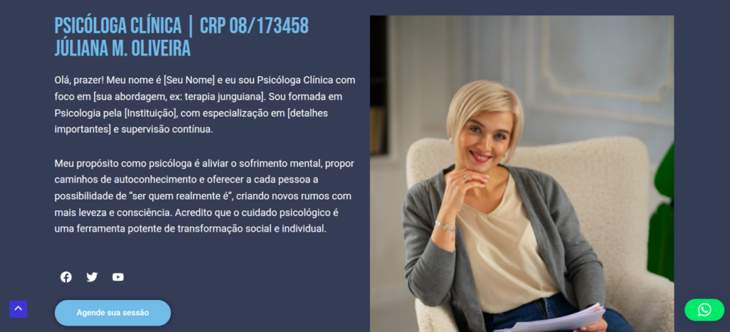 Tenha um site estruturado, com sua biografia, abordagens, serviços, depoimentos e contato via WhatsApp.
